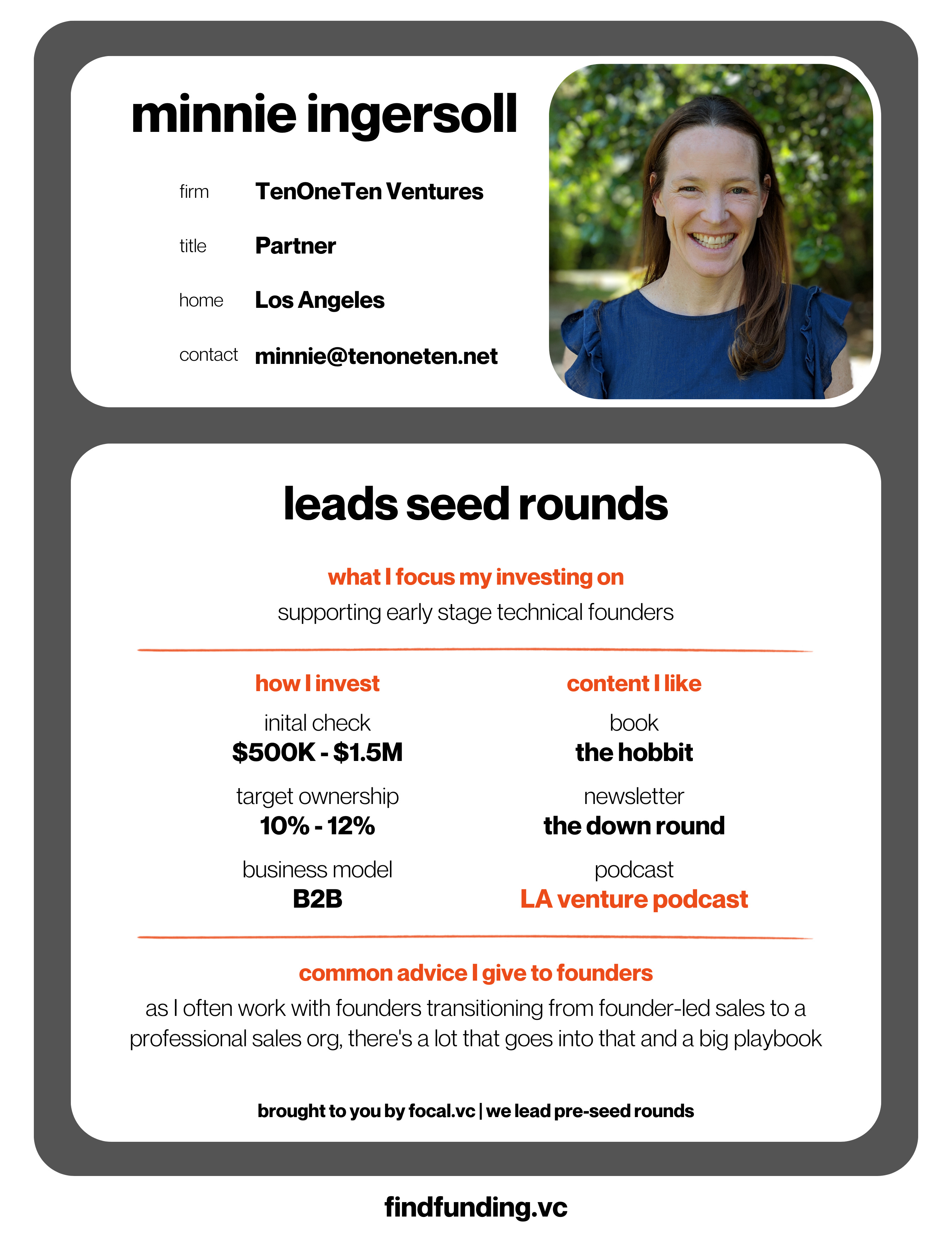 This week's findfunding.vc spotlight is on Minnie Ingersoll from TenOneTen: