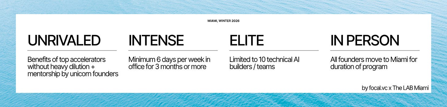 This winter, weโre bringing together 10 hardcore AI builders for an exclusive residency in Miami with all the firepower of a top accelerator without the heavy dilution!
